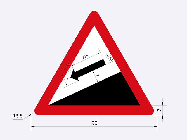 警告標誌之設計,依下列規定: 一、體形 正等邊三角形。 二、顏色 白底、紅邊、黑色圖案。但「注意號誌」標誌之圖案為紅、黃、綠、黑四色。 三、大小尺寸 標準型 邊長九○公分,邊寬七公分。 放大型 邊長一二○公分,邊寬九公分。 縮小型 邊長六○公分,邊寬五公分。 特大型 視實際情況定之。