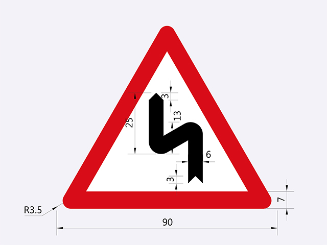 警告標誌之設計,依下列規定: 一、體形 正等邊三角形。 二、顏色 白底、紅邊、黑色圖案。但「注意號誌」標誌之圖案為紅、黃、綠、黑四色。 三、大小尺寸 標準型 邊長九○公分,邊寬七公分。 放大型 邊長一二○公分,邊寬九公分。 縮小型 邊長六○公分,邊寬五公分。 特大型 視實際情況定之。