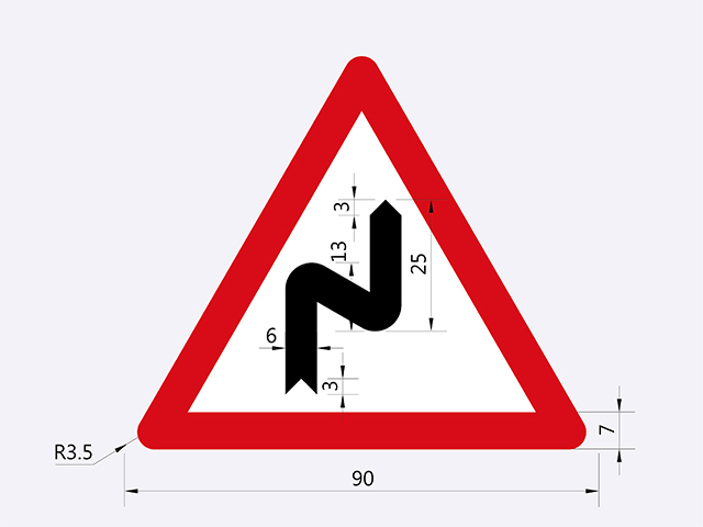 警告標誌之設計,依下列規定: 一、體形 正等邊三角形。 二、顏色 白底、紅邊、黑色圖案。但「注意號誌」標誌之圖案為紅、黃、綠、黑四色。 三、大小尺寸 標準型 邊長九○公分,邊寬七公分。 放大型 邊長一二○公分,邊寬九公分。 縮小型 邊長六○公分,邊寬五公分。 特大型 視實際情況定之。