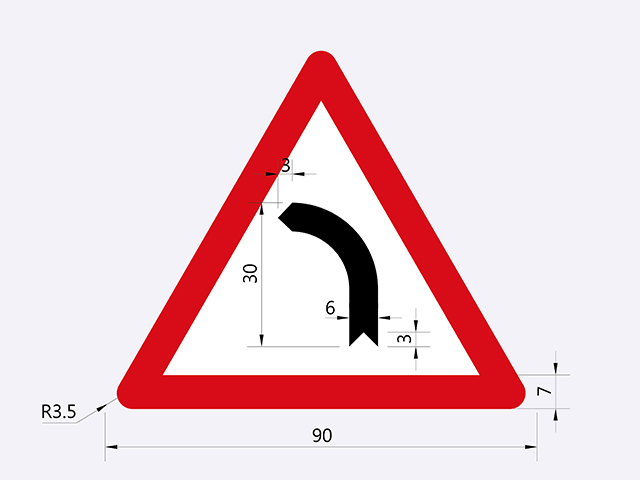 警告標誌之設計,依下列規定: 一、體形 正等邊三角形。 二、顏色 白底、紅邊、黑色圖案。但「注意號誌」標誌之圖案為紅、黃、綠、黑四色。 三、大小尺寸 標準型 邊長九○公分,邊寬七公分。 放大型 邊長一二○公分,邊寬九公分。 縮小型 邊長六○公分,邊寬五公分。 特大型 視實際情況定之。
