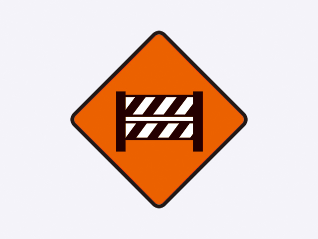 施工標誌,用以告示前方道路施工,車輛應減速慢行或改道行駛。設於施工路段附近。本標誌為菱形或長方形,橙底黑字黑色或白色圖案及黑色細邊,具反光性能,菱形標準型牌面邊長七十公分,放大型牌面邊長九十公分,長方形長一百公分,寬六十公分;其裝設方法與一般豎立式標誌同。