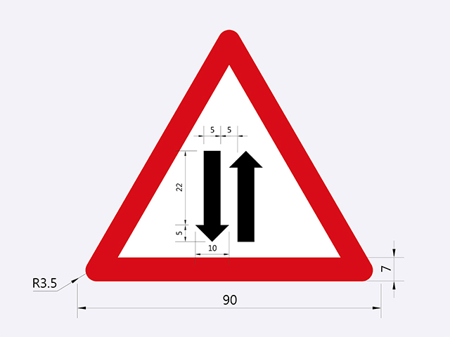警告標誌之設計,依下列規定: 一、體形 正等邊三角形。 二、顏色 白底、紅邊、黑色圖案。但「注意號誌」標誌之圖案為紅、黃、綠、黑四色。 三、大小尺寸 標準型 邊長九○公分,邊寬七公分。 放大型 邊長一二○公分,邊寬九公分。 縮小型 邊長六○公分,邊寬五公分。 特大型 視實際情況定之。