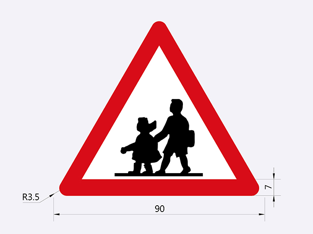 警告標誌之設計,依下列規定: 一、體形 正等邊三角形。 二、顏色 白底、紅邊、黑色圖案。但「注意號誌」標誌之圖案為紅、黃、綠、黑四色。 三、大小尺寸 標準型 邊長九○公分,邊寬七公分。 放大型 邊長一二○公分,邊寬九公分。 縮小型 邊長六○公分,邊寬五公分。 特大型 視實際情況定之。