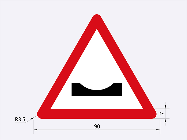 警告標誌之設計,依下列規定: 一、體形 正等邊三角形。 二、顏色 白底、紅邊、黑色圖案。但「注意號誌」標誌之圖案為紅、黃、綠、黑四色。 三、大小尺寸 標準型 邊長九○公分,邊寬七公分。 放大型 邊長一二○公分,邊寬九公分。 縮小型 邊長六○公分,邊寬五公分。 特大型 視實際情況定之。