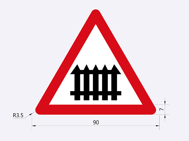 警告標誌之設計,依下列規定: 一、體形 正等邊三角形。 二、顏色 白底、紅邊、黑色圖案。但「注意號誌」標誌之圖案為紅、黃、綠、黑四色。 三、大小尺寸 標準型 邊長九○公分,邊寬七公分。 放大型 邊長一二○公分,邊寬九公分。 縮小型 邊長六○公分,邊寬五公分。 特大型 視實際情況定之。