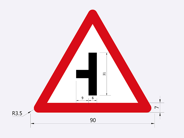 警告標誌之設計,依下列規定: 一、體形 正等邊三角形。 二、顏色 白底、紅邊、黑色圖案。但「注意號誌」標誌之圖案為紅、黃、綠、黑四色。 三、大小尺寸 標準型 邊長九○公分,邊寬七公分。 放大型 邊長一二○公分,邊寬九公分。 縮小型 邊長六○公分,邊寬五公分。 特大型 視實際情況定之。