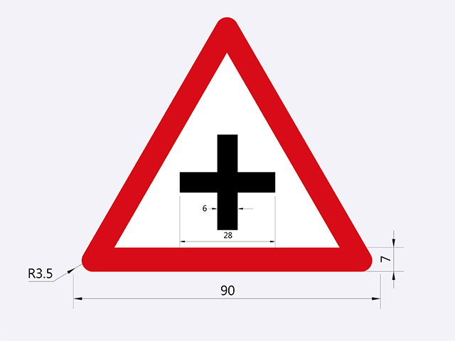 警告標誌之設計,依下列規定: 一、體形 正等邊三角形。 二、顏色 白底、紅邊、黑色圖案。但「注意號誌」標誌之圖案為紅、黃、綠、黑四色。 三、大小尺寸 標準型 邊長九○公分,邊寬七公分。 放大型 邊長一二○公分,邊寬九公分。 縮小型 邊長六○公分,邊寬五公分。 特大型 視實際情況定之。