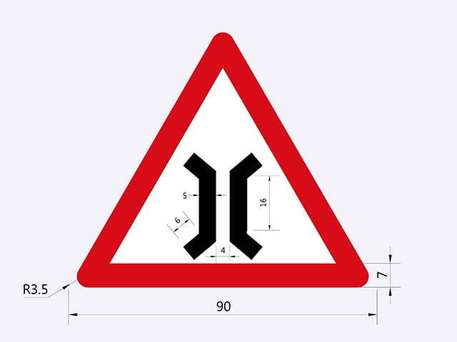 警告標誌之設計,依下列規定: 一、體形 正等邊三角形。 二、顏色 白底、紅邊、黑色圖案。但「注意號誌」標誌之圖案為紅、黃、綠、黑四色。 三、大小尺寸 標準型 邊長九○公分,邊寬七公分。 放大型 邊長一二○公分,邊寬九公分。 縮小型 邊長六○公分,邊寬五公分。 特大型 視實際情況定之。